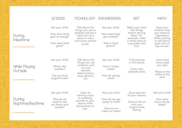 When the acronym is broken down into its parts, you will probably notice that you are already incorporating STEAM into your child’s learning; however, below are some ideas on how you can intentionally incorporate STEAM in your day-to-day activities.