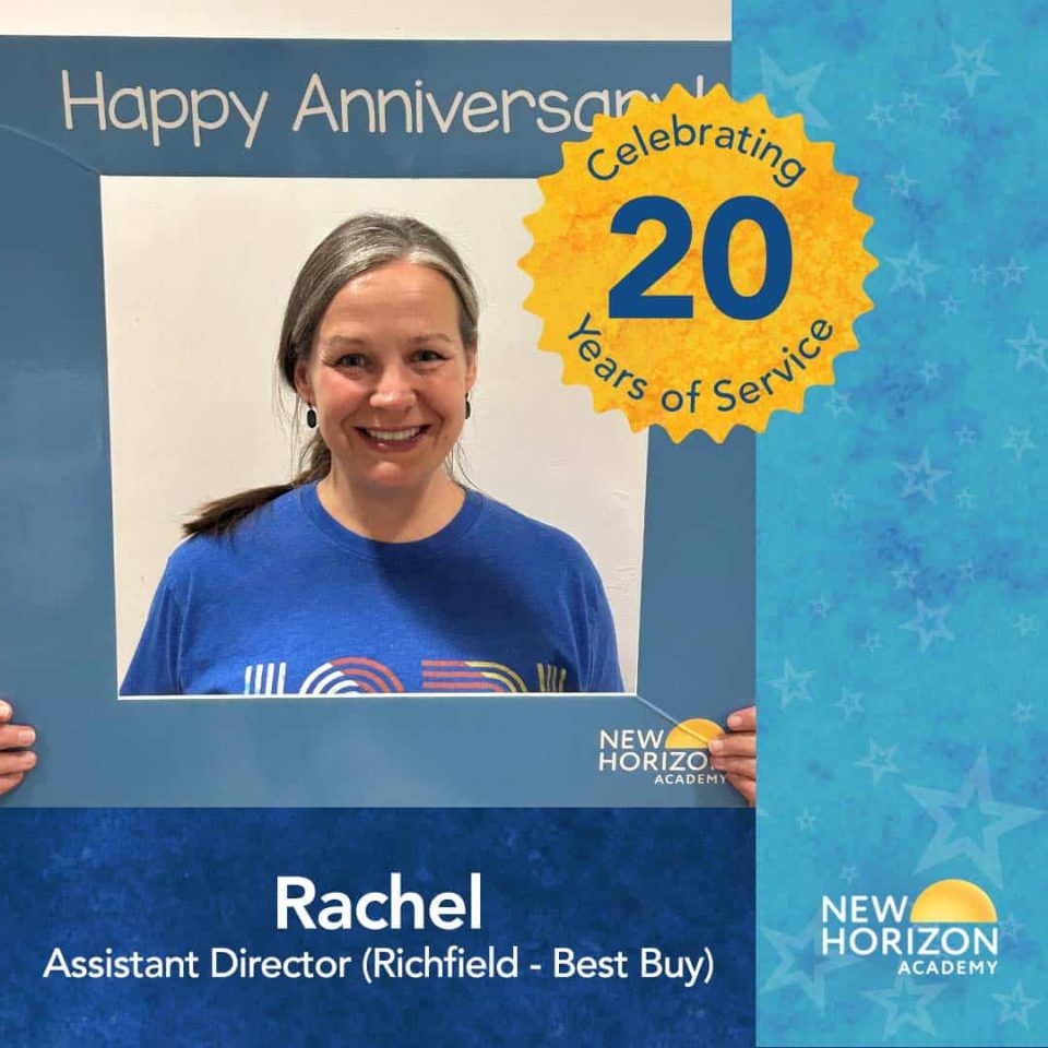 Rachel, the Assistant Director at our Richfield – Best Buy school, is celebrating 20 years with New Horizon Academy! Thank you for your many years of love, dedication, and care. Our children love you, and so do we! Happy anniversary!
